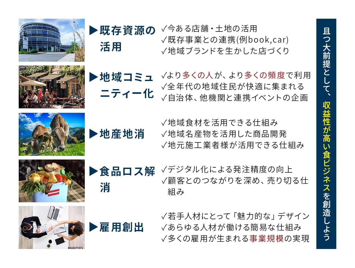 - 外食(カフェ)・食品(ベーカリー・スイーツ等)・生産(店舗ベーカリー生産)の3機能を地域内に張り巡らせることで、安定的な事業基盤の構築も可能に。
