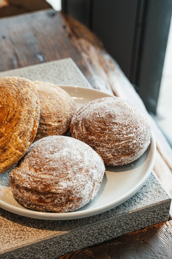 『のびのび』ドーナツは、R Baker で得意のもちもち食感のドーナツ。ドーナツ生地にお餅のような成分をプラスして生地を製造しました。店内で揚げた後、フレーバーシュガーを振り、中には生クリームを詰めています。フレーバーは、定番のシュガー、きな粉、抹茶シュガー、ほうじ茶シュガーと個性豊かなフレーバーを揃えました。表面をキャラメリゼした“ブリュレ”もユニーク。パリッとした食感、もっちりとした生地、そして濃厚な生クリームが絶品です。