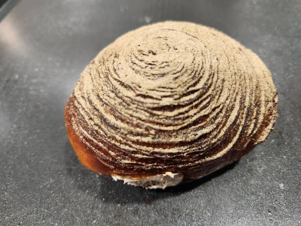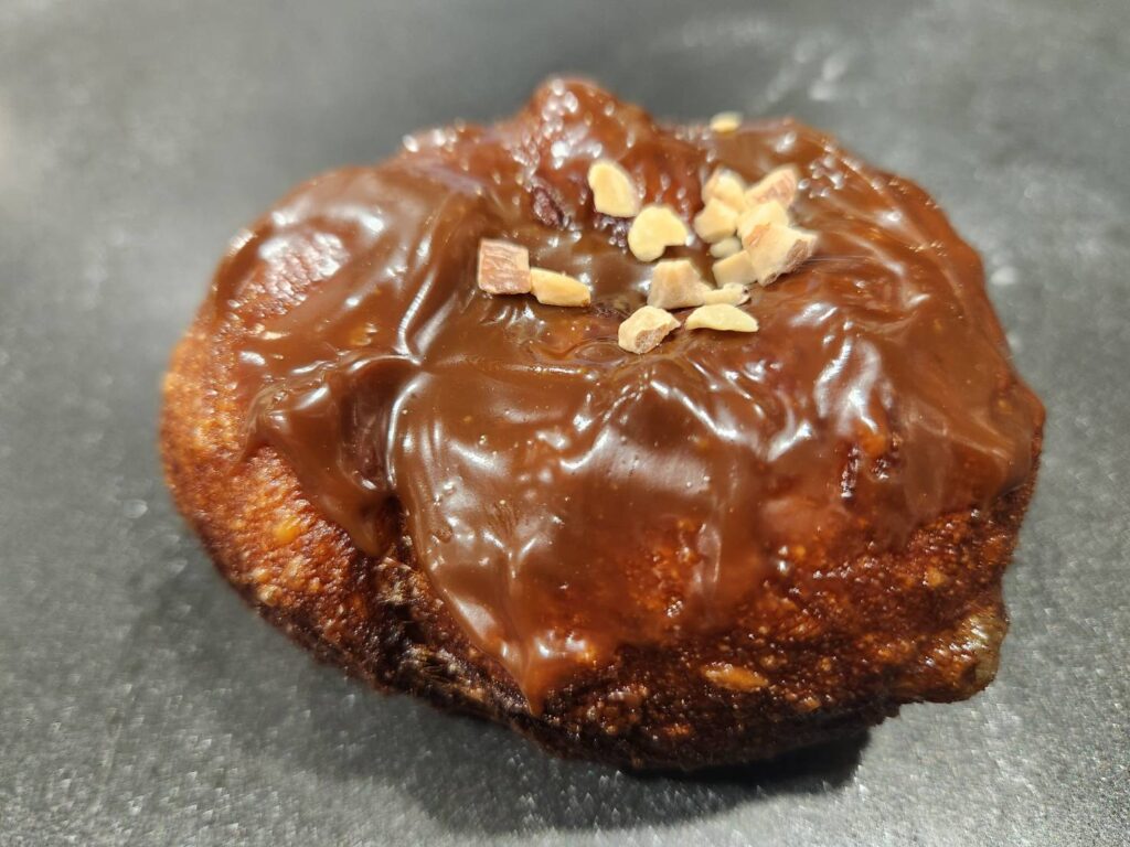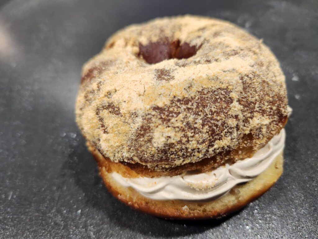 『のびのび』ドーナツは、R Baker で得意のもちもち食感のドーナツ。ドーナツ生地にお餅のような成分をプラスして生地を製造しました。店内で揚げた後、フレーバーシュガーを振り、中には生クリームを詰めています。フレーバーは、定番のシュガー、きな粉、抹茶シュガー、ほうじ茶シュガーと個性豊かなフレーバーを揃えました。表面をキャラメリゼした“ブリュレ”もユニーク。パリッとした食感、もっちりとした生地、そして濃厚な生クリームが絶品です。